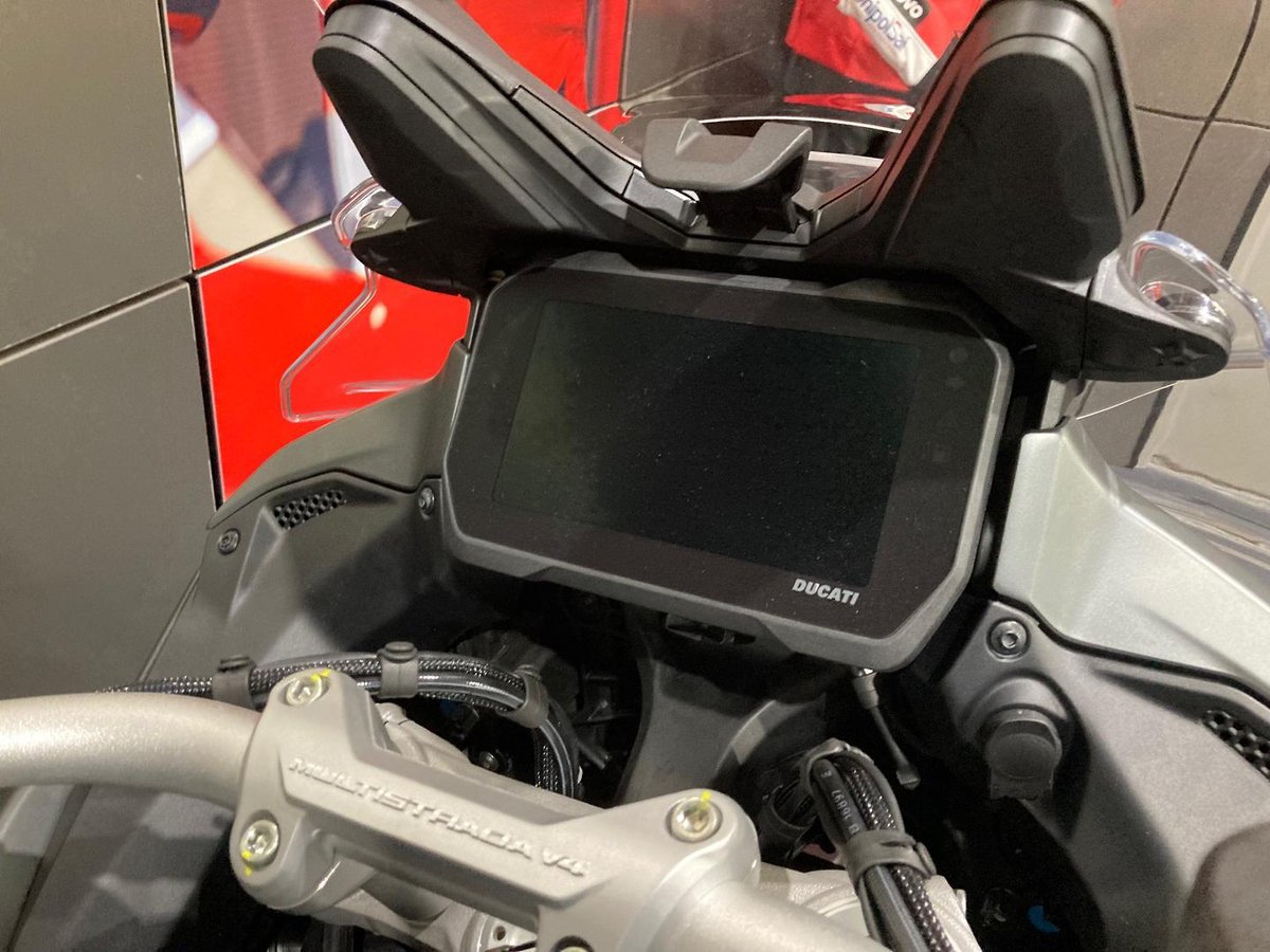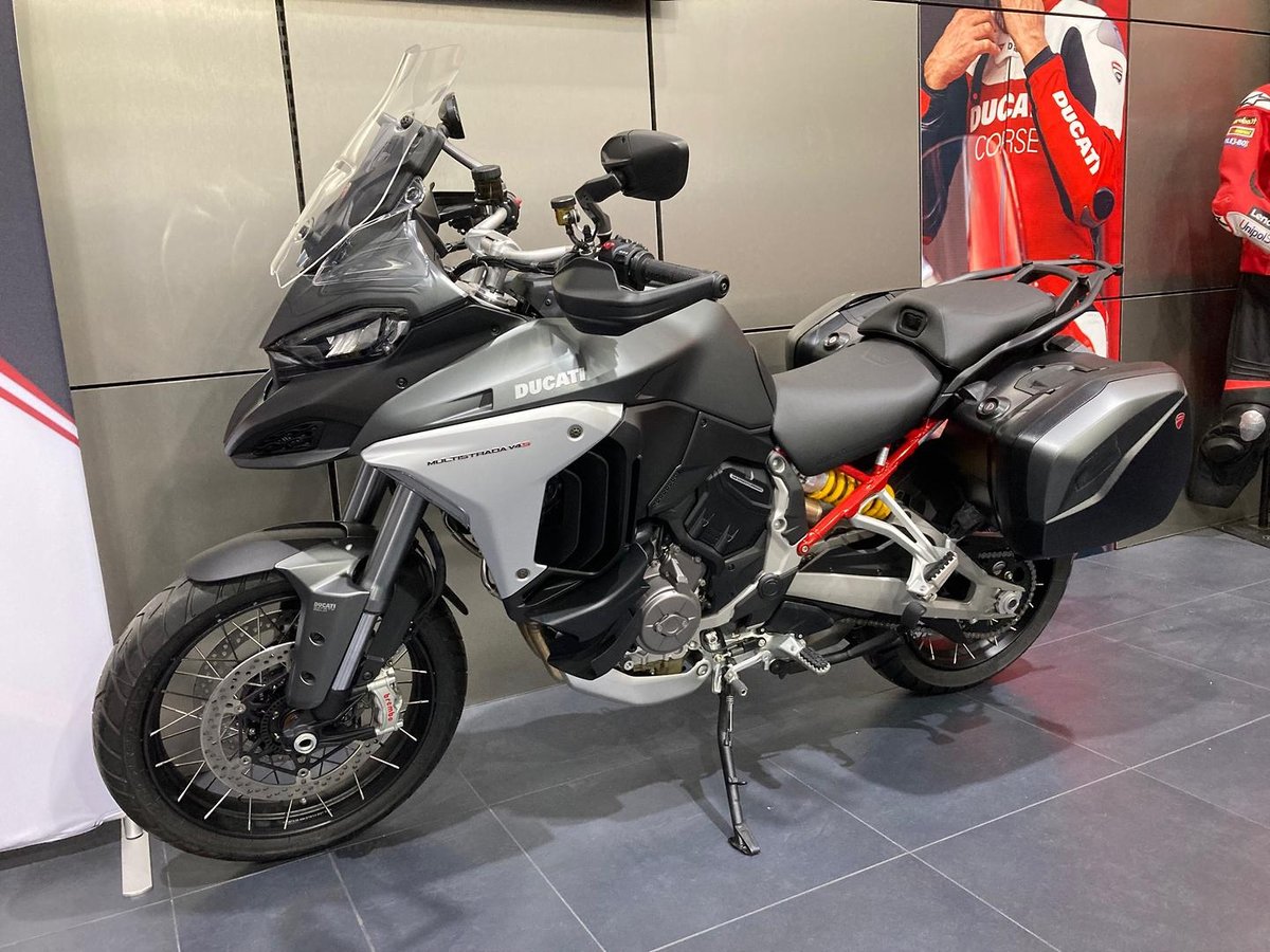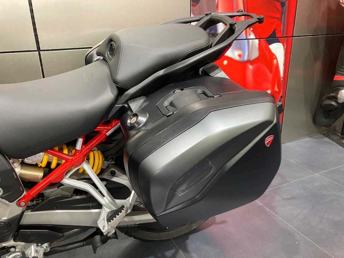 The Multistrada V4 S comes standard with the Travel & Radar package which includes Rigid Side Panniers, Blind Spot Detection, and Adaptive Cruise Control.