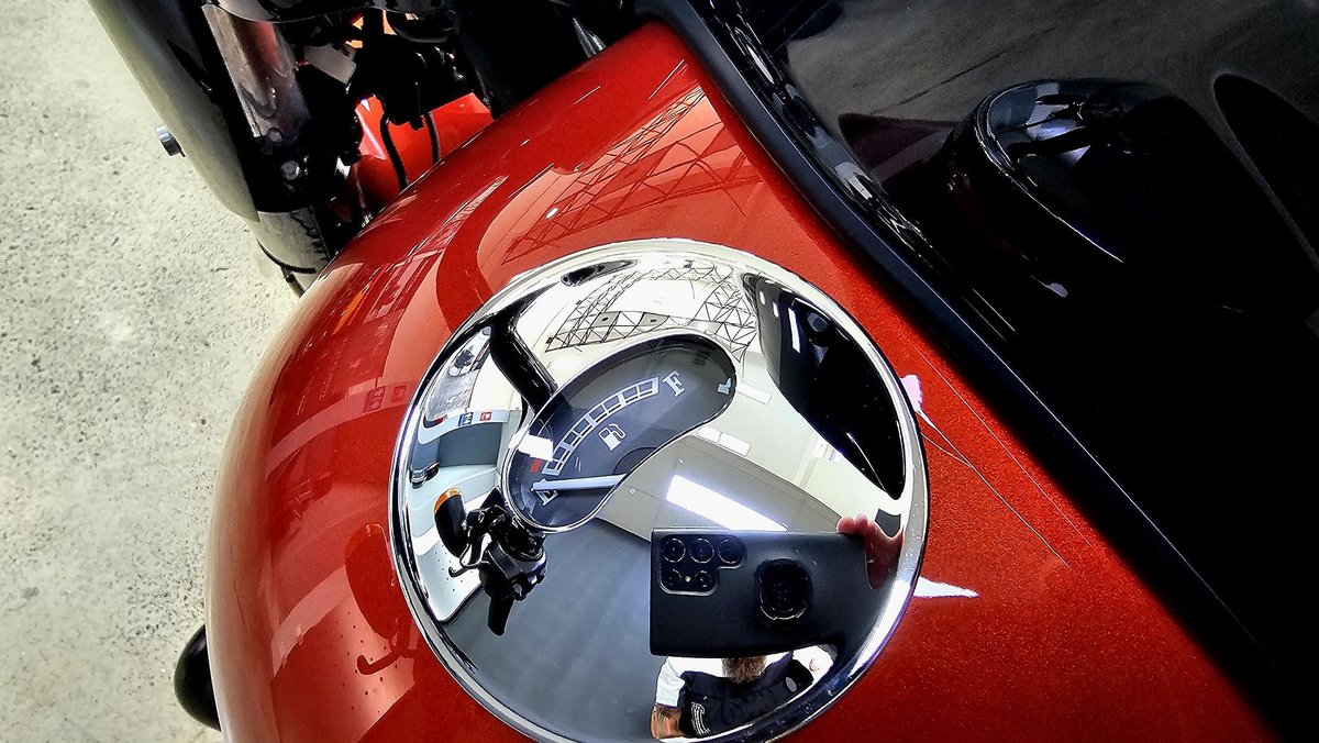 A blacked-out powertrain is built with a mix of gloss and matte to provide depth and texture. Contrasted against is Harley-Davidsons 'Whiskey Fire' paint giving a deep red, gloss and a metallic finish.